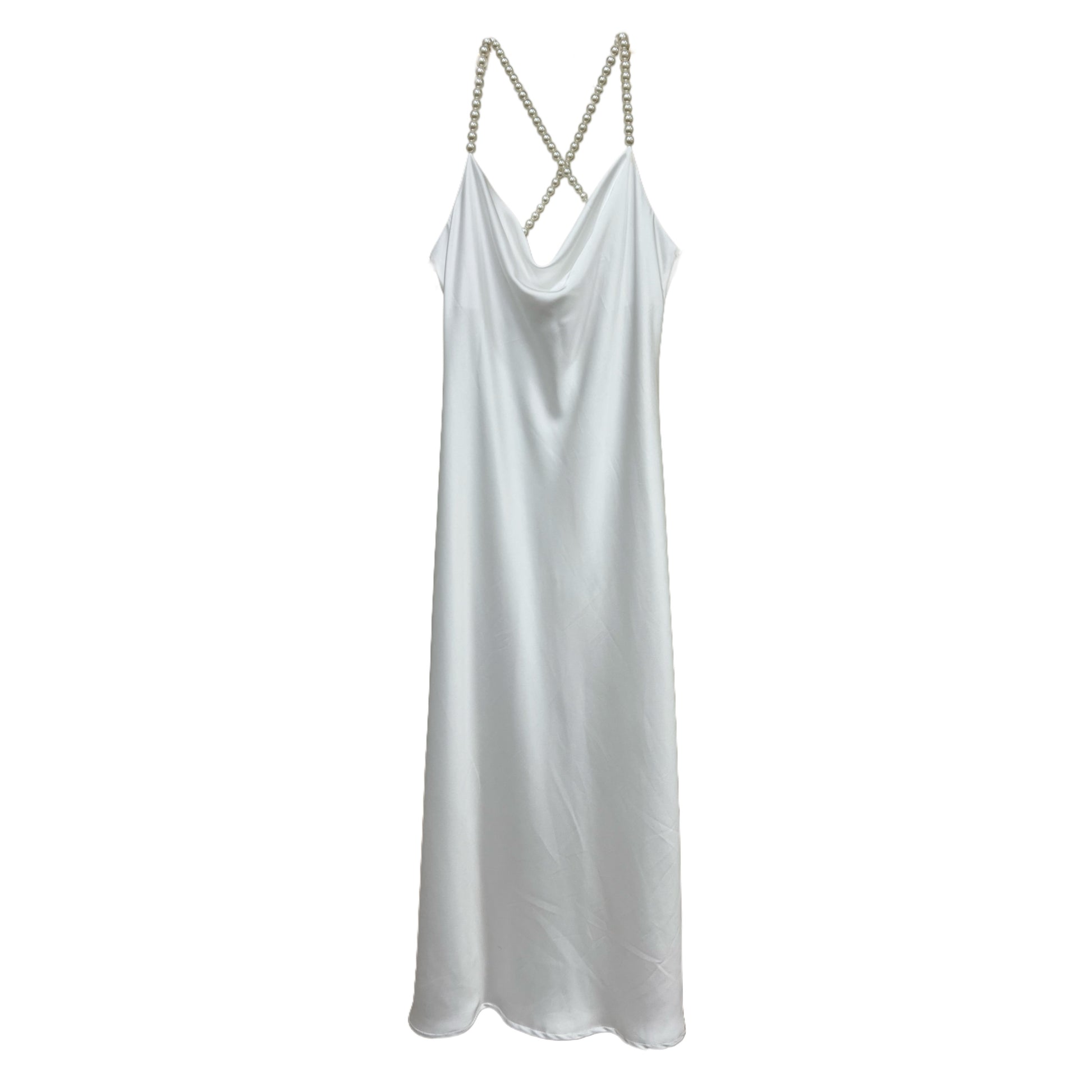 Abito in satin prodotto in Italia. Un abito scivolato e sinuoso tg unica in grado di vestire da una XS ad una L per enfatizzare la vostra femminilità e farvi sentire meravigliose, la lavorazione delle spalline (in perle sintetiche per abbigliamento) vi consentirà di indossare l'abito in tre varianti differenti. Spallina dritta, incrociata davanti e monospalla ma sarà possibile giocare anche con la scollatura sul retro creando i medesimi effetti. Un abito scivolato da indossare per ogni occasione, dagli aperitivi al mare al tramonto fino ai vostri eventi più importanti. Pensato per essere indossato anche dalle testimoni/ damigelle per la sua versatilità, regalando ad ognuna di loro la possibilità di personalizzare lo scollo con le spalline di perle creando look differenti con un unico abito.